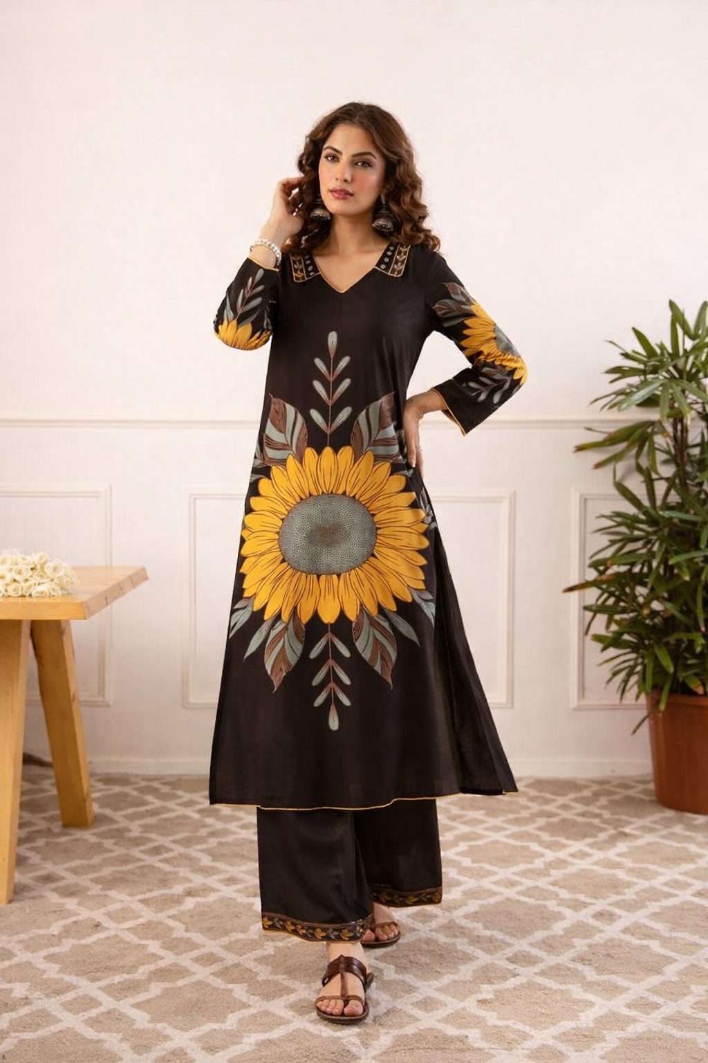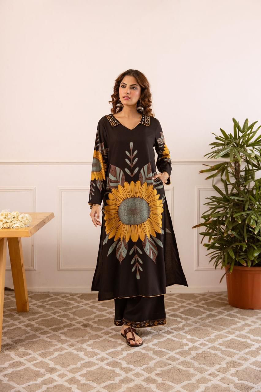 Made from premium soft rayon, this black and yellow co-ord set features bold sunflower prints on both front and back. Lightweight, breathable, and stylish—perfect for effortless everyday elegance.